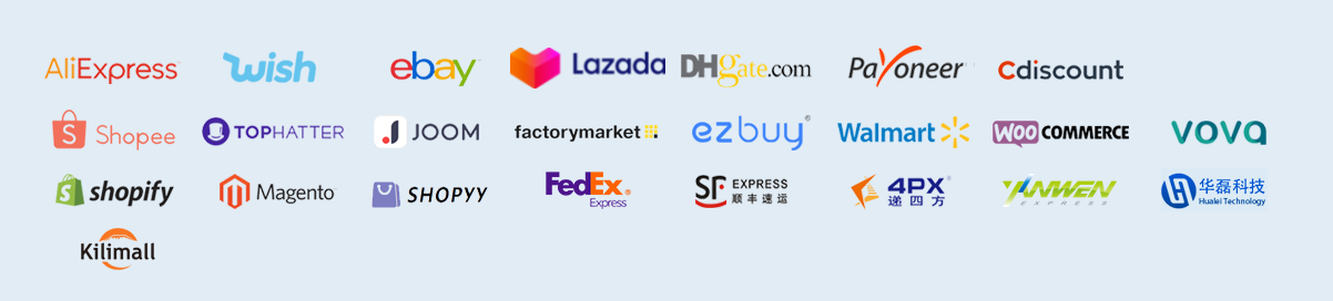 ALIexpress、速卖通、eBay、Wish、亚马逊、Lazada、敦煌网、Shopify、Cdiscount、Shopee、Tophatter、Joom、Ezbuy、沃尔玛、Woocommerce、Vova、SHOPPY、mangeto等。