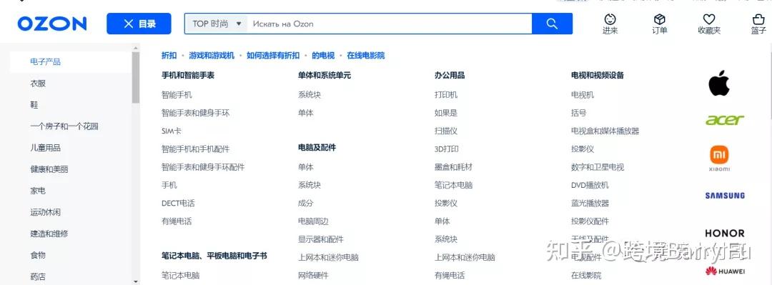目前在OZON平台卖得最好的,是3C电子类产品,包括手机、耳机。我们也可以通过平台前台的目录可以看到,其他电商平台目录前面基本上是一些服装类,美妆类,电器类等,OZON平台将电子类商品放到目录最前面的位置,事实也证明3C电子类产品也是OZON平台卖的最好的。