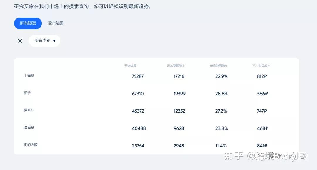 宠物在俄罗斯受欢迎的程度不亚于我们国内,我们也可以通过平台数据看到,前1%的热销商品中宠物用品的占比也是相当大。主要是猫和狗的相关产品,从搜索词的热度以及搜索量上来看都是非常直观的。